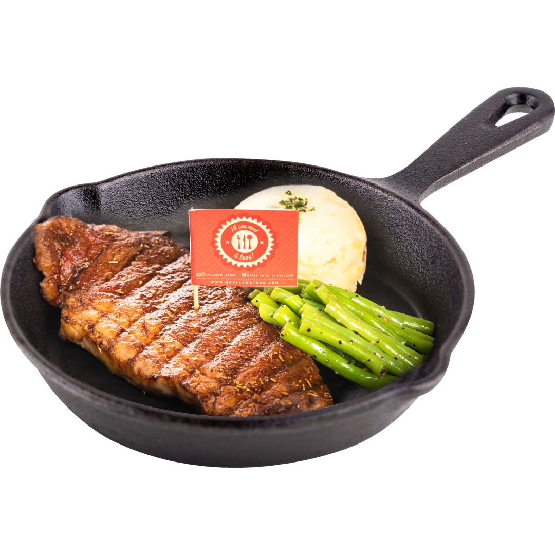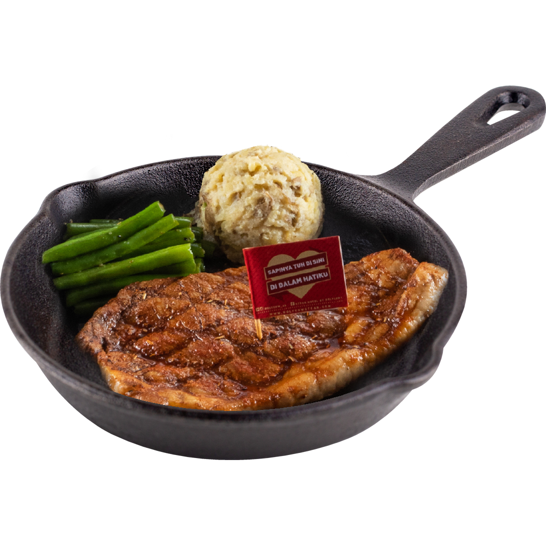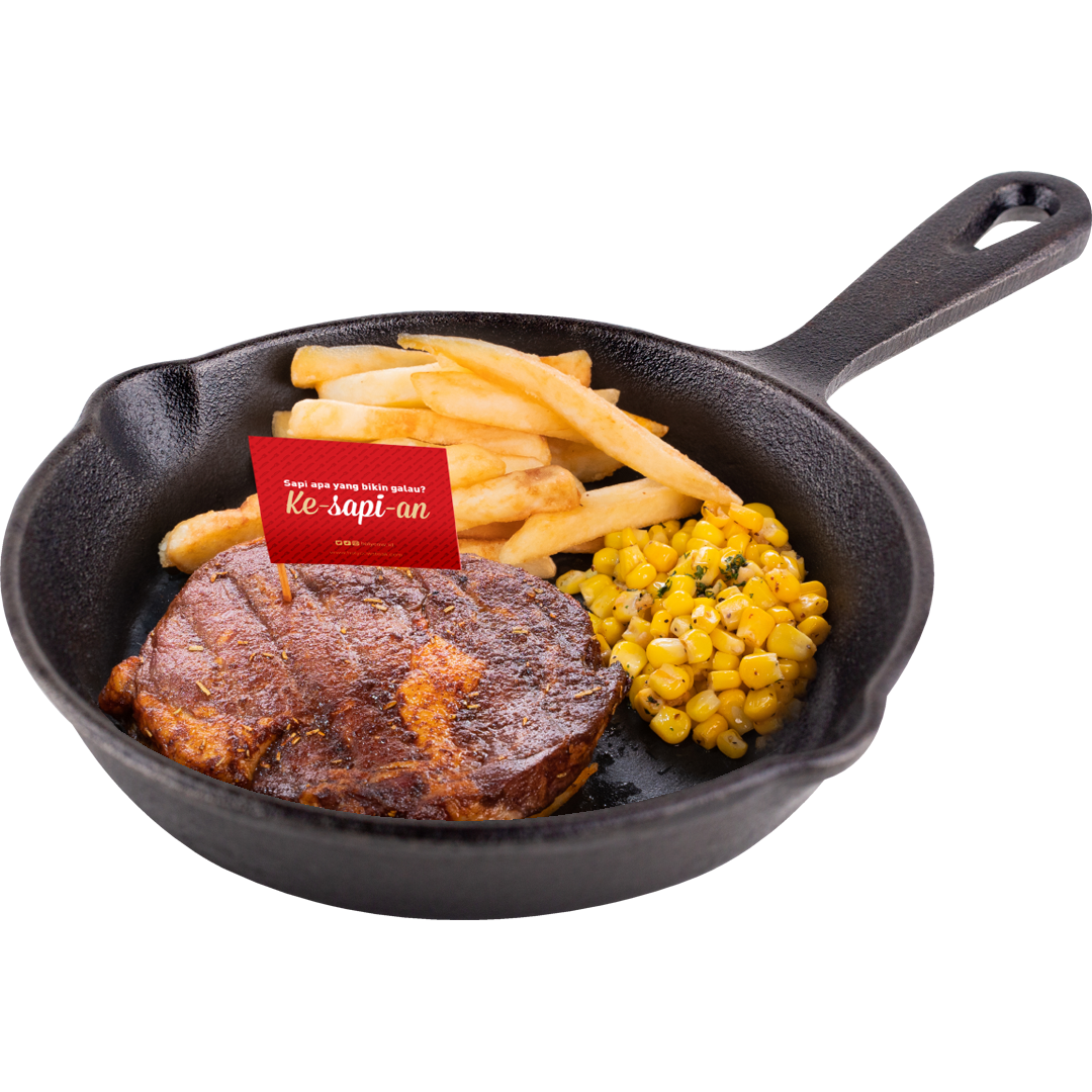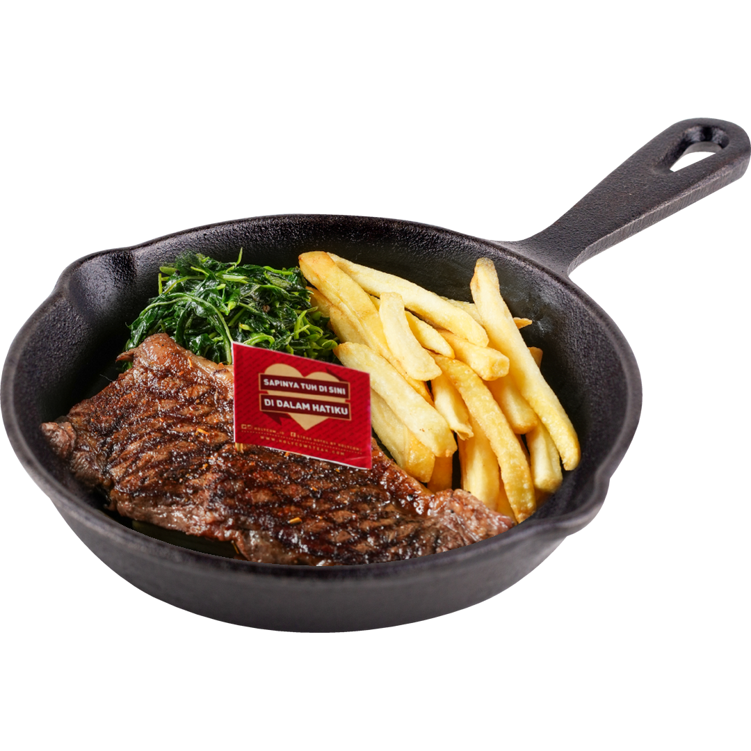 Black Angus Sirloin, 200 gr. Disajikan dengan peppercorns sauce, french fries dan salad