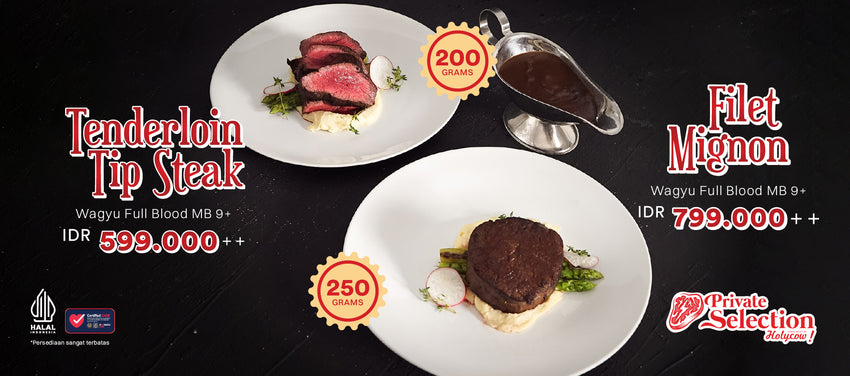 Sesuai dengan visi sebagai Meat Expert, pada kampanye Holycow’s Private Selection yang dijalankan 1 November-29 Februari 2024, Steak Hotel by HOLYCOW! menggunakan potongan steak premium yang jumlahnya sangat terbatas dari Wagyu Fullblood MB 9+, yaitu Filet Mignon & Tenderloin Tip. Masing-masing potongan daging ini dibanderol dengan harga yang cukup terjangkau yaitu Rp 799.000++ untuk Filet Mignon dan Rp 599.000++ untuk Tenderloin Tip. Hal ini tentunya bertujuan untuk menciptakan pengalaman makan steak limited edition dari Sapi Ras Jepang Murni 100% tanpa ada perkawinan silang, sekaligus merasakan daging dengan grade marbling paling tinggi. Disajikan dengan Au Jus Sauce, Grilled Asparagus, dan Mashed Potato semakin membuat menu ini menjadi spesial.