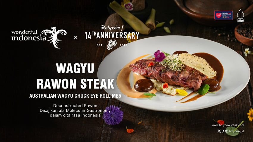 Wagyu Rawon Steak, merupakan wujud dari perjalanan panjang Steak Hotel by HOLYCOW! selama belasan tahun dalam menghadirkan menu-menu steak yang lezat dan inovatif. Menu ini terinspirasi dari makanan Jawa Timur yang memiliki ciri sup dengan warna pekat dan citarasa khas karena menggunakan kluwek sebagai bumbu utamanya, dan biasanya disajikan dengan taburan tauge.