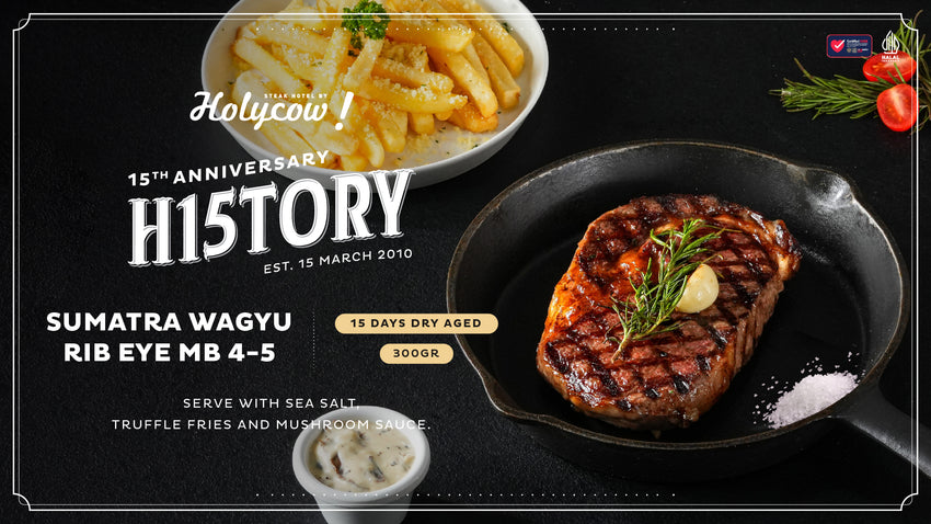Sebagai bagian dari perayaan ulang tahun yang ke-15, Steak Hotel by HOLYCOW! menghadirkan menu spesial Sumatra Wagyu Rib Eye MB 4-5 15 Days Dry Aged 300 gram. Menu ini diproses dengan metode dry age sehingga menghasilkan tekstur yang lebih lembut dan kaya rasa.