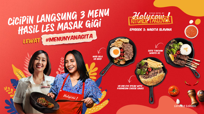 Steak Hotel by HOLYCOW! tahun ini kembali hadir dengan program “Holycow’s Kitchen Takeover” yang menggandeng meat enthusiast sekaligus figur publik ternama, Nagita Slavina. Kolaborasi ini merupakan wujud inovasi dari Steak Hotel by HOLYCOW! untuk selalu memberikan pengalaman kuliner terbaik bagi pelanggan. Setelah sukses dengan dua figur ternama sebelumnya, kali ini “Holycow’s Kitchen Takeover” menghadirkan kreasi menu steak yang terinspirasi dari comfort food yang dekat dan digemari oleh konsumen Indonesia, yaitu, Sate Taichan Wagyu A5, Nasi Gila US Beef Sirloin, dan US Rib Eye Steak dengan Saus Parmesan